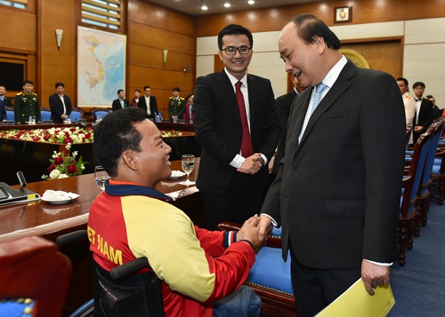 Thủ tướng thăm hỏi VĐV cử tạ Lê Văn Công. Ảnh: VGP/Quang Hiếu |